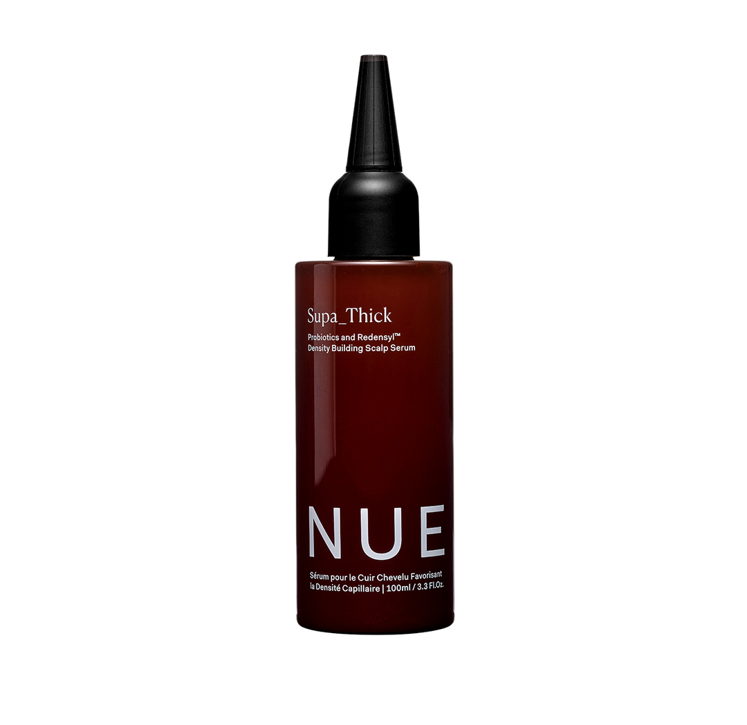Excess product build-up and dead skin cells can inhibit new hair growth by blocking follicles during the growth phase. SUPA_THICK uses a postbiotic to gently cleanse and exfoliate the scalp. Postbiotics are compounds (metabolites) created by probiotic bacteria, and we use lactic acid to gently cleanse, treat and condition the skin on the scalp (there’s a reason it’s a go-to ingredient in skincare).